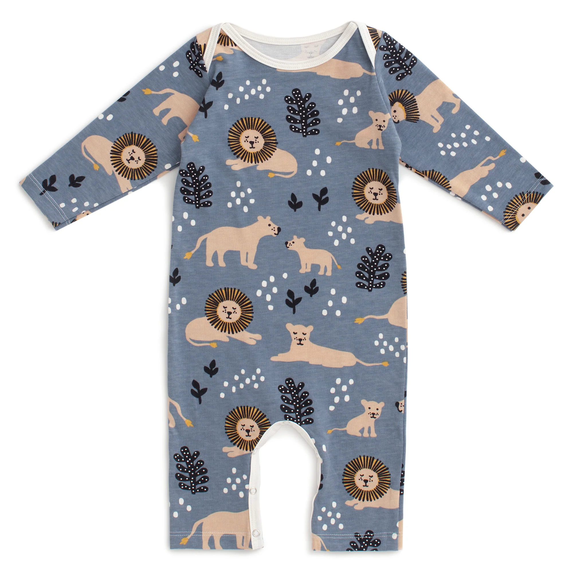 The perfect one-piece outfit, in our Lions print! A family of lions basks in the warm savanna sun.