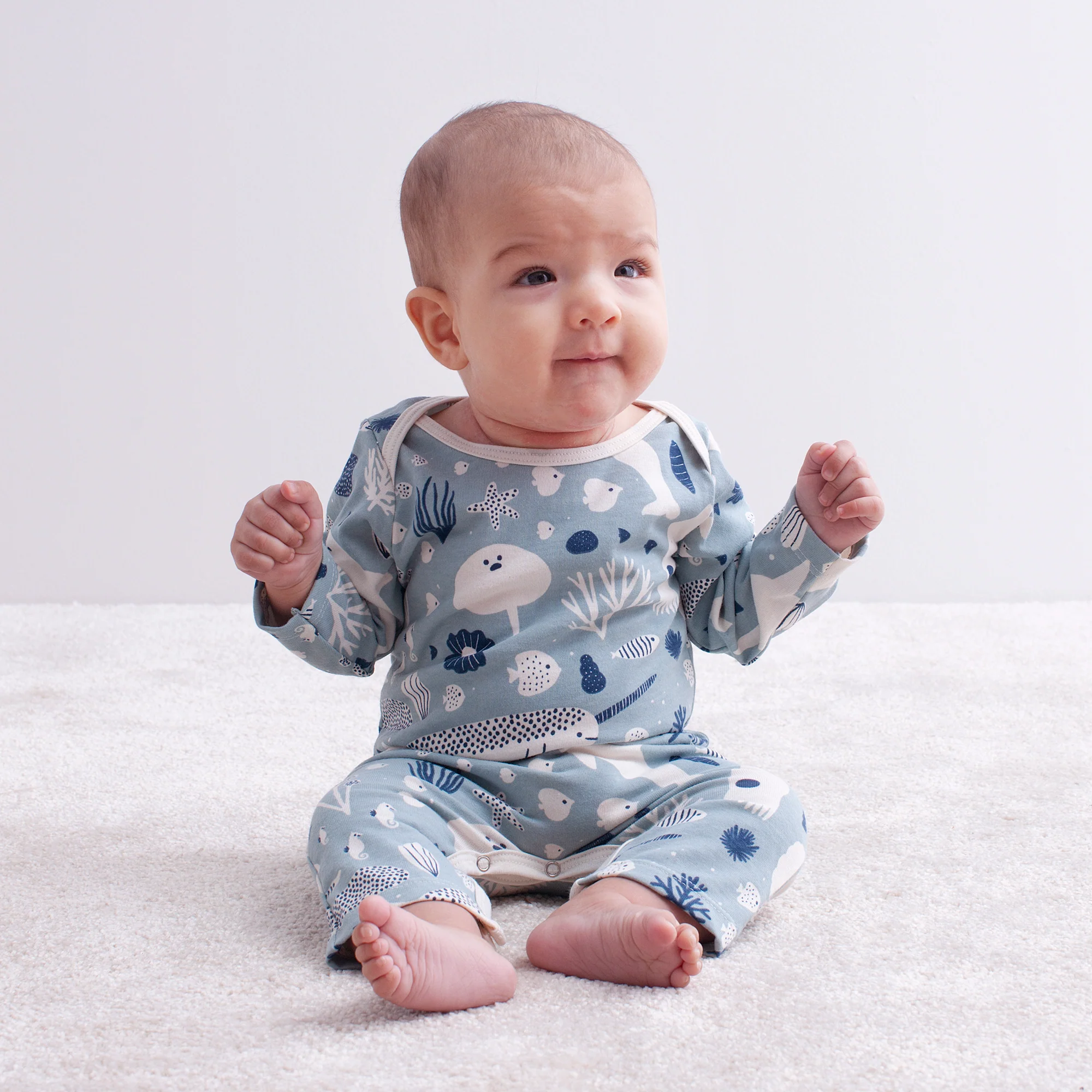 Our classic long-sleeve rompers have lap neck openings for quick and easy ons and offs, and 7 snaps along the inside of the legs on wide binding for withstanding wriggly babies and many, many trips through the washing machine.
